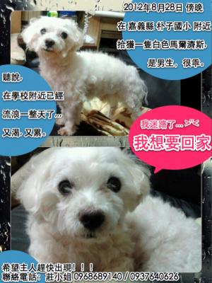 *8/28 在朴子國小附近撿到/拾獲一隻馬爾濟斯,公的。
