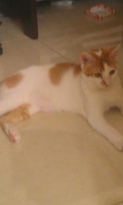 特徵: 8-9個月大,還不滿一歲,頭上有一個橫看像月亮,又像<這個形狀的白色斑紋,右邊屁股有一大塊橘色斑紋臉一看,粉紅色的鼻子和腳脯,走失時未戴項圈 |
