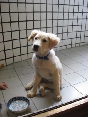 2013年3月28日在永和市竹林路發現一隻疑似迷路,尚未植晶片4個月大11~12公斤黃金獵犬(可能有混拉不拉多血統),毛色淡米黃色,拾獲那天早上原來毛色乾淨,有剃毛。愛跟人,很乖不會隨便汪汪叫,應該原本有受過一些訓練。附近鄰居說早上6~7點時就有看到狗狗在竹林路一直繞了。希望主人能趕快把狗狗帶回家。